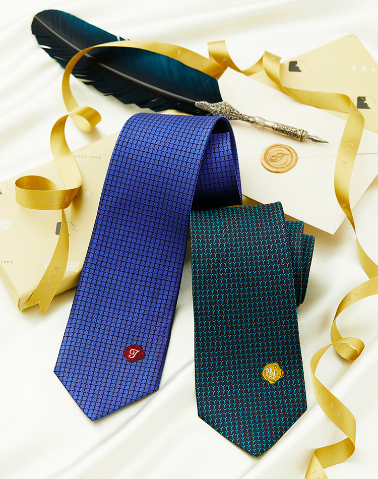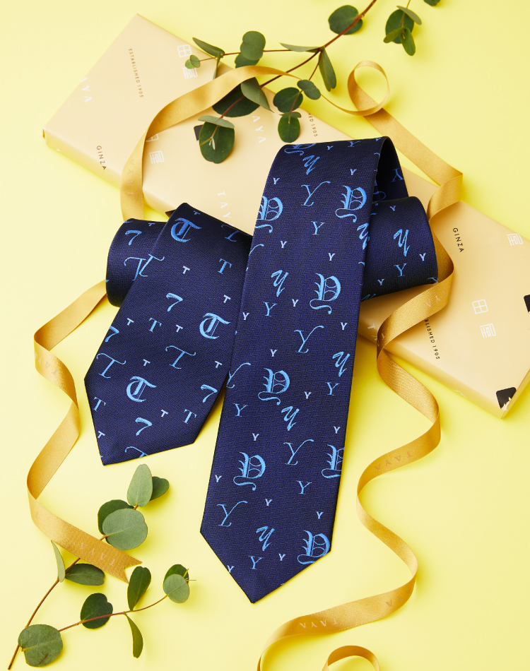 毎年新作で揃う、アルファベット26種の〈イニシャルタイ〉。今年のテーマは、かつて文書の封印に使用されたシーリングスタンプ(封蝋)。個人の象徴としてスタンプに使われた印璽や紋章を、優雅な筆記体の英文字26文字に置き換えて、モダンなワンポイント柄に仕上げました。