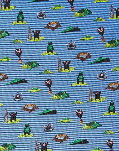 バッグ片手に、くまモンが銀座でショッピング!?リアルな銀座のビルと、くまモンの対比が可愛らしいネクタイ。好奇心いっぱいに銀ブラを楽しむくまモン。銀座熊本館へも立寄ったことでしょう。