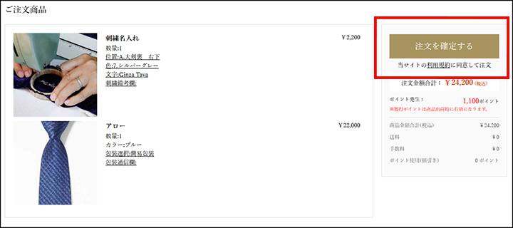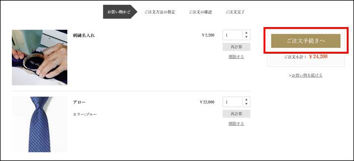 カートにネクタイと「刺繍名入れ」が入っていることを確認し「ご注文手続きへ」をクリックしてください。「ご注文方法の指定」ページに移動します。