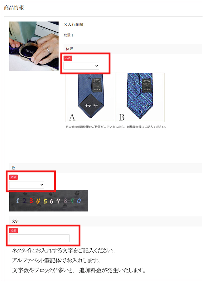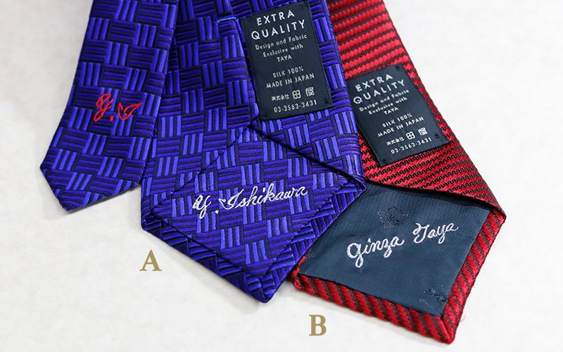 銀座田屋オンラインショップでは名入れ刺繍の際、「刺繍位置」「刺繍色」「刺繍文字」がご指定頂けます。