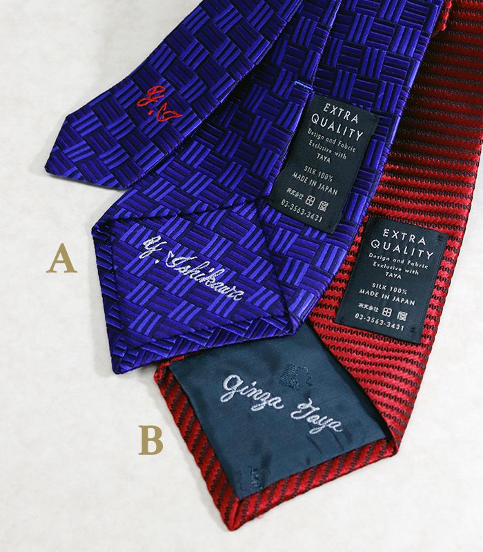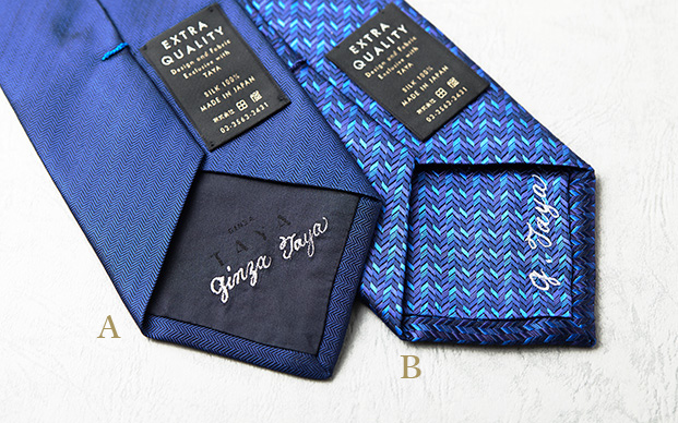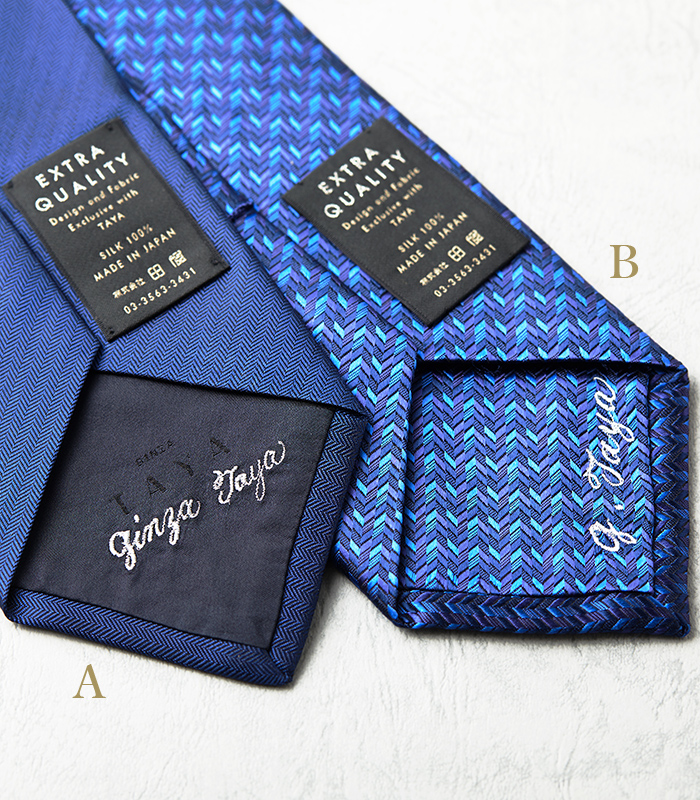 ※「ELETTO700シリーズ」は裏生地にも、ネクタイと同じ生地を使う「とも裏(刺繍位置サンプル画像A.大剣裏 中央)」を採用しております。オリジナルタイと裏生地が異なりますのでご注意ください。また、「ELETTO700/ラグジュアリーシリーズ」では、あらかじめ生地にLUXURYの文字が入るため、裏生地への刺繍はお薦めできません。